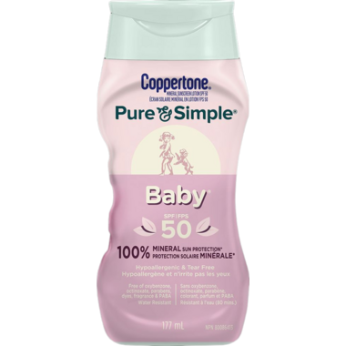 Keep your little one safe in the sun with Coppertone Pure & Simple SPF 50 mineral sunscreen lotion for babies. This gentle, 100% zinc oxide mineral sunscreen is hypoallergenic and provides broad spectrum UVA/UVB protection. This body sun cream contains no PABA, parabens, phthalates, fragrances, dyes or oxybenzone - and is water-resistant (80 minutes) so you don't have to worry about them getting wet. Just apply this face and body sun lotion on your baby and enjoy some summer fun!