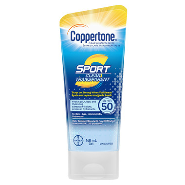 Coppertone Sport Clear Suncreen Gel SPF 50 provides broad spectrum UVA/UVB sunburn protection in a hydrating and cooling feeling formula. Specially formulated for active adults, this sweat, heat, and water resistant formula rubs in quickly and leaves no white residue. This sunscreen retains its SPF after 80 minutes of activity in the water or sweating.