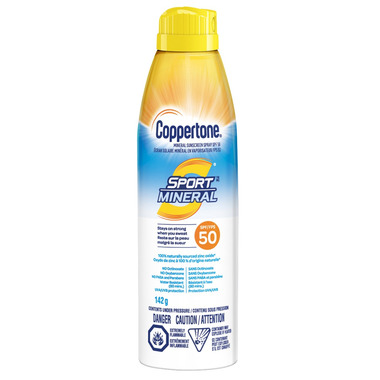 Your favourite Coppertone Sport Sunscreen Spray is now available in a safe SPF 50 mineral formula made with 100% naturally sourced zinc oxide! This easy to apply sunscreen comes in a continuous spray bottle and stays on strong when you sweat, providing effective UVA/UVB protection while practicing your favourite outdoor sports like running, hiking, and volleyball. Ready to hit the water? This zinc oxide sunscreen formula is water-resistant and sweat-resistant up to 80 minutes. Plus, it contains no octinoxate, oxybenzone, PABA, or parabens.