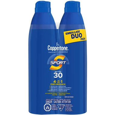 Whichever outdoor activity youre passionate about, Coppertone Sport SPF 30 Sunscreen Spray is on your team. Designed to stay on strong while you're active, this high-performance spray sunscreen SPF 30 protects you from the sun with a sweat and water resistant sunscreen formula (80 minutes). This durable yet lightweight sunscreen spray offers Broad Spectrum UVA/UVB protection in a moisturizing formula that leaves a light, breathable feeling on your skin while keeping it hydrated. Gentle on the skin, this body sunscreen spray rubs on easily and does not clog pores or run into your eyes. This sunscreen body spray has a continuous sprayer for application at any angle. Each sunscreen Coppertone creates follows a tradition of trusted, quality sun protection products. Coppertone has been providing continuous innovation for more than 75 years, and is voted the most trusted sunscreen brand.* Depend on this tough sport sunscreen spray during any outdoor activities, whether youҒre getting out for a work day, heading to the big game or enjoying an afternoon of fun in the sun. *Voted Most Trusted Sunscreen Brand by Canadian shoppers based on the 2023 BrandSpark Canadian Trust Study