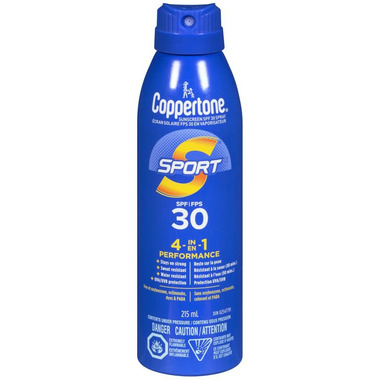 Whichever outdoor activity youre passionate about, Coppertone Sport SPF 30 Sunscreen Spray is on your team. Designed to stay on strong while you're active, this high-performance spray sunscreen SPF 30 protects you from the sun with a sweat and water resistant sunscreen formula (80 minutes). This durable yet lightweight sunscreen spray offers Broad Spectrum UVA/UVB protection in a moisturizing formula that leaves a light, breathable feeling on your skin while keeping it hydrated. Gentle on the skin, this body sunscreen spray rubs on easily and does not clog pores or run into your eyes. This sunscreen body spray has a continuous sprayer for application at any angle. Each sunscreen Coppertone creates follows a tradition of trusted, quality sun protection products. Coppertone has been providing continuous innovation for more than 75 years, and is voted the most trusted sunscreen brand.* Depend on this tough sport sunscreen spray during any outdoor activities, whether youҒre getting out for a work day, heading to the big game or enjoying an afternoon of fun in the sun. *Voted Most Trusted Sunscreen Brand by Canadian shoppers based on the 2023 BrandSpark Canadian Trust Study