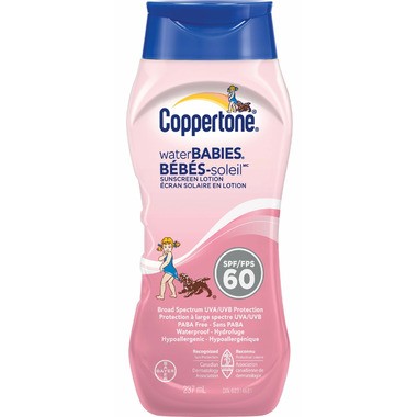 Coppertone Water Babies Sunscreen Lotion SPF 60 is a gentle and non-stinging sunscreen that offers effective broad-spectrum UVA/UVB protection for baby's delicate skin. The special blend of moisturizers leaves baby's skin soft and supple. The non-comedogenic formula provides a subtle baby powder fragrance. Waterproof upon application it retains its SPF after 80 minutes of activity in the water. PABA, paraben and colorant free. Dermatologist tested.