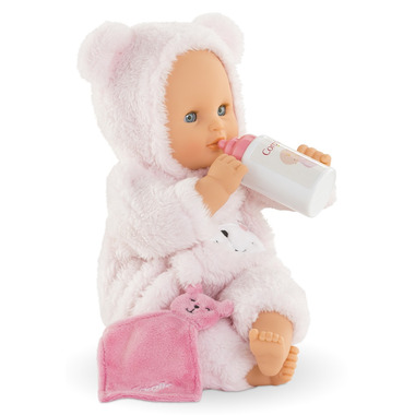 The doll's blue sleepy eyes close when it's put down for a nap or at bedtime, also like a real baby. Bebe Calin Loving Teddy Bear's furry "suit" is removable to reveal a printed body. The doll comes complete with a feeding bottle and lovey and is part of the mon premier poupon Corolle collection of dolls, clothing and accessories for early nurturing time.