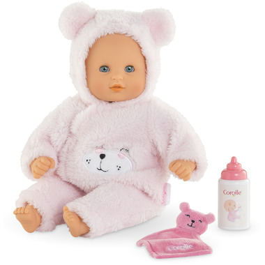 Corolle Bebe Calin Loving Teddy Bear is a 12-inch baby doll that is perfectly sized to be cradled in a young child's arms and is ideal for hugging and cuddling. The doll's face, arms and legs are made of touchably soft vinyl that is delicately scented with vanilla -- a Corolle signature. Bebe Calin Loving Teddy Bear's soft body is poseable, like a real baby.