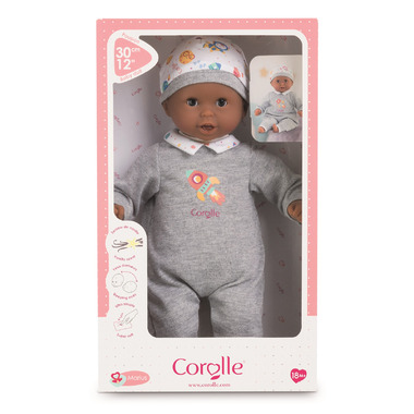 Bebe Calin Marius is a 12- inch baby doll - the perfect size for little mommies and daddies to rock and cradle in their arms. Its soft body is posable like a real baby and its dark brown sleepy eyes close when it's put down for a nap or at bedtime. The doll's head, arms and legs are made of soft-to-the-touch vinyl that is delicately scented with vanilla - a Corolle signature. Bebe Calin Marius is dressed in a grey onesie with a matching stocking cap and is part of the mon premier poupon Corolle Collection of dolls, clothing and accessories for for beginning doll play.