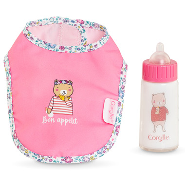 The Pink Bib & Magic Feeding Bottle Set is essential for taking care of your big Corolle doll (36 to 42 cm) like a grown-up! You put the bib on your baby to protect his clothes and feed him with the magic bottle. What's more, it feels like there really is milk inside the bottle! The pink bib is worked with a floral bias. A pretty teddy bear silkscreen is printed in the center.