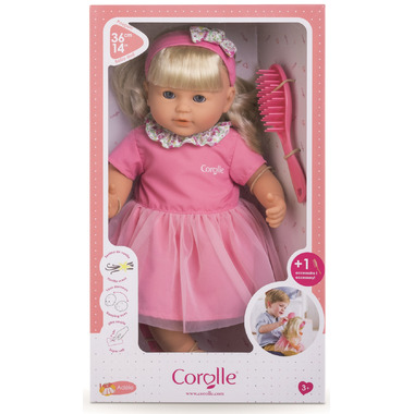 Adele is a 14-inch, soft-bodied mon grand poupon Corolle baby doll for little ones wanting a baby of their own to love. With her long easy-to-style hair, children are introduced to hairstyling play (hairbrush included). Adle has blue sleepy eyes that close when she is put down for a nap or at bedtime and her head and limbs are made of soft, supple vinyl that is delicately scented with vanilla - a Corolle signature. She is dressed in a pretty pink dress and wears a coordinating headband and removable pink ballerina flats.