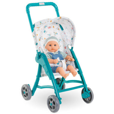 Go for a walk with your little one and do what Mum and Dad do. The Teddy Bear Stroller is the perfect opportunity to gain confidence during first steps and take your 12 inches (30 cm) baby for a walk. This blue stroller is made from teddy bear-print fabric. It's lightweight and easy to use. The sunshade is retractable. Once assembled, it can no longer be folded. To be assembled by an adult.