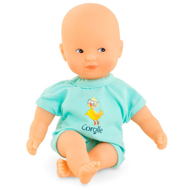 Mini Bath Blue is an 8-inch doll that is specially designed for water play fun. Lightweight and the perfect size to take along everywhere, it's an ideal play companion for bathtime as well as poolside or at the beach. Its vinyl head and limbs are soft to the touch and delicately scented with vanilla, a Corolle signature. Mini Bath Blue is part of the mon premier poupon Corolle collection of dolls, clothing and accessories for early nurtering time. With brown painted eyes.