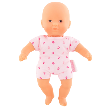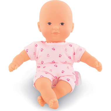 Mini Calin Pink is an 8-inch baby doll that is light weight and the perfect size to take along everywhere. Its head and limbs are made of soft-to-the touch vinyl that is lightly scented with vanilla - a Corolle signature. With brown painted eyes. Mini Calin Pink is part of the mon premier poupon Corolle collection of dolls, fashions and accessories for early nurturing time.