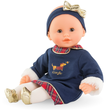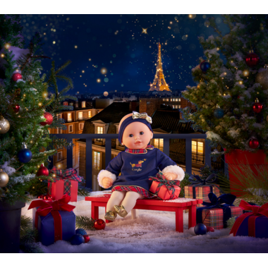 Bebe Calin Margaux Holidays is a 12- inch (30 cm) baby doll - the perfect size for little mommies and daddies to rock and cradle in their arms. Its soft body is posable like a real baby, and its blue sleepy eyes close when it's put down for a nap or at bedtime, also like a real baby. The doll's face, arms and legs are made of soft-to-the-touch vinyl that is delicately scented with vanilla, a Corolle signature.
