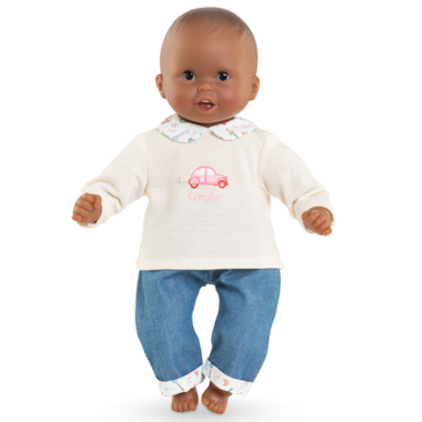 For a casual outfit, the Week-end Paris Long Sleeve T-Shirt and Jeans set is the ideal garment for little dolls aged 30 cm, my first Corolle doll. This outfit, which combines softness and practicality, consists of a long-sleeved cream T-shirt with an illustration of a 4L car, and blue imitation denim pants. The exclusive Week-end in Paris print on the T-shirt's Claudine collar, sleeve elbow patches and pants hem reflects Corolle's attention to detail. Made in soft, resistant materials, it's easy to put on thanks to hook-and-loop fasteners adapted to the dexterity of little hands.
