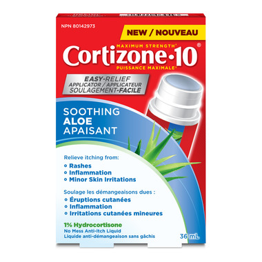 - ACTIVE INGREDIENT: Cortizone-10 Soothing Aloe Easy Relief Applicator is a medicated no mess anti-itch liquid formulated with 1% hydrocortisone, a *maximum strength itch relief ingredient available without a prescription