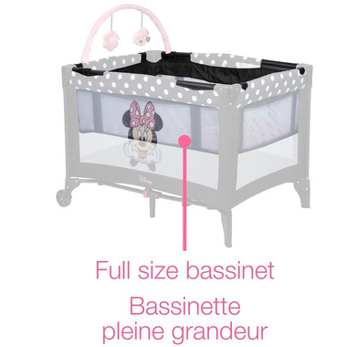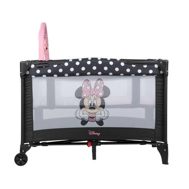 Your child will have fun playing at home or anywhere you travel with the Cosco Disney Peeking Minnie Playard thats easy to set up in just minutes. Stylish and cute in pink and black, this mini nursery is both a cozy bassinet and full-size play yard that gives baby plenty of space to nap or play. The bassinet comforts your resting child and has an open-view, breathable mesh with an adorable Minnie graphic.
