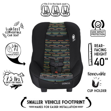 The Cosco Scenera NEXT is simply a smarter car seat designed for families who know what they need. It keeps kids safer with Side Impact Protection built right in, and a 5-point harness that adjusts easily from the front of the seat. The harness features 5 heights and 3 buckle locations so you can be sure you're giving the best fit to your growing child. And to fit your growing family (or the neighborhood car pool), the Scenera NEXT easily fits three across in the back seat. If your chosen vehicle happens to be an airplane, the Scenera NEXT has got you covered. Certified for use on aircraft, it gives your child a familiar seat during the flight. The lightweight and compact design also get you through the airport without weighing you down. Once arrived at your destination, the Scenera NEXT is super-easy to install in grandma's car or your rental car. With kids in the car, messes happen. Now, thanks to the easy-to-clean car seat pad, theres no need to stress. The pad comes in a wide range of styles and colors, all of which remove from the seat and are both machine washable and dryer safe. Theres also no more scrubbing goopy build-up from inside the cup holder; its dishwasher safe. For both seat pad and cup holder, a thorough wash is just a machine cycle away.