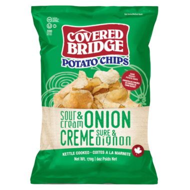 Old fashioned kettle cooked Covered Bridge Sour Cream and Onion made with dark russet potatoes.