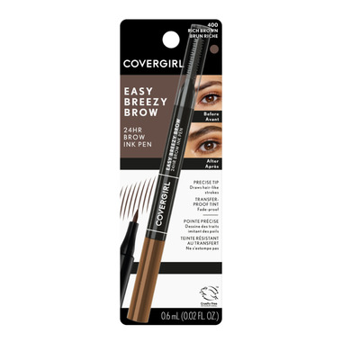 Make microblading easy and pain-free with COVERGIRL Easy Breezy Brow 24 Hour Brow Ink Pen. Featuring a dual applicator, the eyebrow pens ultra-precise felt-tip lets you easily create full, feathered-looking brows, while the spoolie comb helps tame and groom brows. You can confidently rock your look all day long knowing the color-true, water-resistant tint wonҒt smudge, transfer, or fade. This eyebrow enhancing makeup feels lightweight and comfortable on brows and is easy to remove with soap and water. Pro-tip: Make your look last even longer by topping with COVERGIRL Easy Breezy Volumizing Brow Gel. At COVERGIRL, they're Leaping Bunny approved cruelty free by Cruelty Free International, so you know our products are never tested on animals.