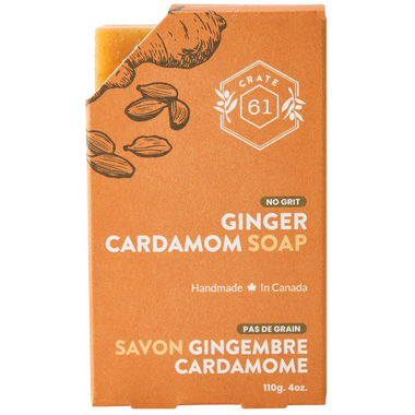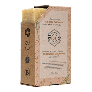 Crate 61's Ginger & Cardamom Bar Soap is made with a brilliant combination of fresh ginger, and warm & spicy cardamom soaked in sweet citrus and black pepper oil! Exclusively with certified vegan and cruelty free ingredients in a fully biodegradable paperboard box. Cold pressed extra virgin olive oil and unrefined avocado oil lend a rich bubbly lather that will leave your skin super soft and moisturized.