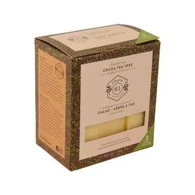 Ingredients: Saponified: Extra Virgin Olive Oil, Palm Oil, Coconut Oil, Cocoa Butter, Avocado Oil, Tea Tree essential oil, Lemon essential oil.