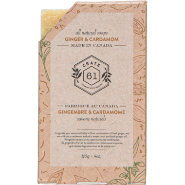Crate 61's Ginger & Cardamom Bar Soap is made with a brilliant combination of fresh ginger, and warm & spicy cardamom soaked in sweet citrus and black pepper oil! Exclusively with certified vegan and cruelty free ingredients in a fully biodegradable paperboard box. Cold pressed extra virgin olive oil and unrefined avocado oil lend a rich bubbly lather that will leave your skin super soft and moisturized.
