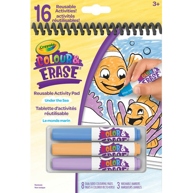 Crayola Colour & Erase Reusable Activity Pad: Under the Sea lets kids colour delightful ocean-themed colouring pages with vibrant, washable markers. Its never been easier to colour, wipe clean, and colour again. This reusable activity pad is all parents need to give kids screen-free art time while travelling. Double-sided pages mean 16 different scenes to explore. All Crayola Colour & Erase products offer less-mess art experiences that kids can create again and again! Each item in the line produces vibrant colours on surfaces that can be easily erased with a damp cloth. Includes 8 Dual-Sided, Reusable, 5 x 7 Activity Pages and 3 Washable Markers. Safe and nontoxic, this set is the ideal practice-makes-perfect activity for young artists ages 3 and up.