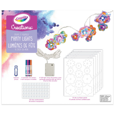 Create beautiful blooms to light up your room with Crayola Creations Create It Yourself Party Lights! Design and colour your very own unique, blossoming party lights – simply colour in each petal with the included markers, dip them in water to create fun tie-dye effects and assemble the blooms to create colourful lights unique to you! Includes pre-assembled LED light strand with battery pack, 4 washable mini markers, 72 die cut flower petals, 50 clear reinforcements and 1 pair of tweezers. Ages 8+.