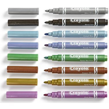 Rich, radiant and shiny. Crayola Metallic Markers add an extra sleek sheen to homemade cards, crafts and colourful art projects. Includes 8 Metallic Markers.