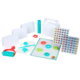 To get started, apply the Glitter Dots on the included mat. Then use the roller with cutter attachments or the shape cutters to create your own custom design. Apply the design to customize one of the included cardstock elements or get creative and find different surfaces to apply your design to.