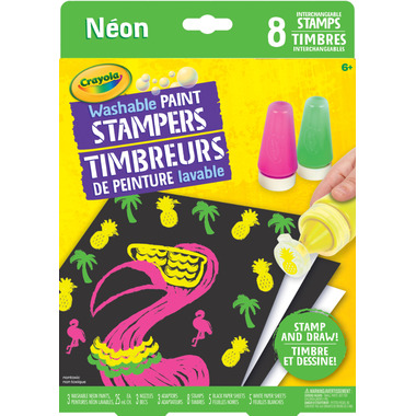 Creative kids can get crafty inside or outside with the Crayola Washable Neon Paint Stampers. The set makes a great gift and offers hours and hours of creative entertainment! These paints wash from skin and most washable clothing so parents dont have to worry. Stamp art is easy with step-by-step instructions that make this set fun and simple for kids to use.Features (3) 1oz Paint Bottles, 3 Nozzles, 3 Connectors, 8 Stamps, 5 White Cardstock and 5 Black Cardstock. Ideal painting set for kids, ages 6 and up!