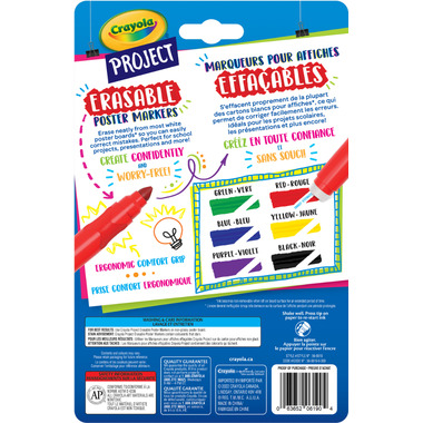 Crayola Project Erasable Poster Markers offer bold colours that you can erase just in case! These markers erase thoroughly from most poster board and heavy cardstock. Perfect for school projects, presentations and more! Mistakes can be neatly erased so you can create confidently and worry-free! Each marker has an ergonomic grip that is comfortable to hold. They are also fitted with chisel tip nibs which offer the ability to make thick or thin lines. Project Poster Markers for kids are essential for creating better school projects and posters at science fairs, art class, and beyond. Set includes Erasable Poster Markers in a colourful array of Red, Yellow, Green, Blue, Purple, and Black. Safe and nontoxic, the perfect art tool for kids ages 6 and up.
