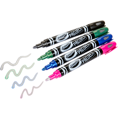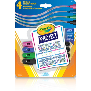 From the Crayola Project line, Metallic Outline Markers have a unique laydown that display 2 colours with one stroke. When applied to poster & foam board the ink naturally separates and creates a beautiful outlining detail. Add special shimmery effects to art projects, crafts, and homework assignments. This set includes 4 Metallic Outline Markers great for both light and dark surfaces featuring black, green, blue, and pink outlines.