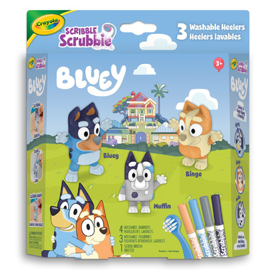 Kids will be thrilled to go on an epic adventure with the Crayola Scribble Scrubbie Bluey 3ct Playset. This Playset allows kids to add their favorite Bluey characters to their Scribble Scrubbie collection. With Bluey, Bingo, and Muffin included, children can explore their imagination and play make-believe. The set comes with 6 markers and a brush, perfect for creating fun spots on their new friends' fur or giving these playful pups adorable costumes. Decorate your Scribble Scrubbie Bluey friends with the included character stickers, adding a touch of whimsy and personal flair to each character, making playtime even more exciting and engaging.