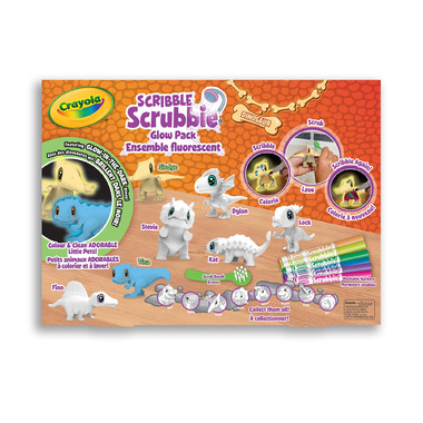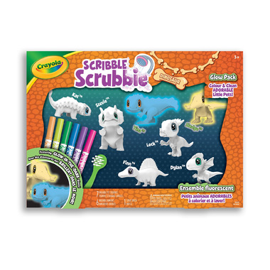 This Scribble Scrubbie dinosaur glow combo set features 7 dinosaur pets (including 2 glow-in-the-dark dinos), 6 washable markers, and 1 scrub brush. Decorate pets in your own dino-mite designs, then wash them clean and start again as many times as you like. Two of the dinos glow in color, adding even more excitement to this unique coloring activity! Plus, the featured washable markers are easy to clean from skin and most washable clothing, leaving stains virtually extinct!