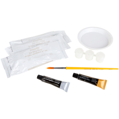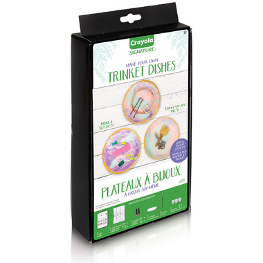 Crayola Signature DIY Trinket Bowl kit comes with three 4oz Packs of Air Dry Clay, 2 Signature Acrylic Paints, Paint Brush, Plastic Bowl (for shaping) and an Instruction Booklet.