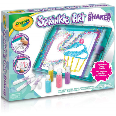 The Crayola Sprinkle Art Shaker includes the Sprinkle Shaker unit, 5 sprinkle tubes, 12 project sheets, 6 glue tubes and instructions. Ages 5+.
