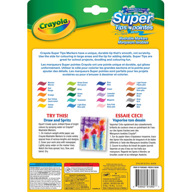 Great for any creative project, Crayola Super Tips Washable Markers can be used to write, draw, or colour in large areas. With creatively designed conical tips, the markers allow kids to make both thick and thin lines, giving kids better control of their creativity.