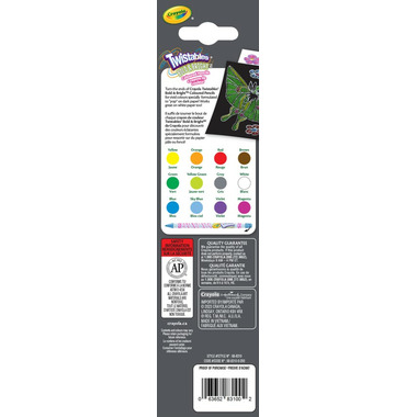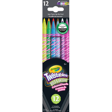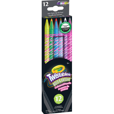 Crayola Twistables Coloured Pencils are the easy way to colour on the go, and now they are available in Bright & Bold colours that work on both light and dark paper! Avoid waiting for a sharpener to continue using your favourite colours or cleaning up pencil shavings that always end up creating a mess, these coloured pencils don't require sharpening. Simply twist up for more colour, or twist down to protect the colour core. The plastic casing makes it easy to see how much colour is left, while the pencil size never changes, so it's always easy to hold. Pair with Bold & Bright crayons and markers (each sold separately). They are perfect for classrooms and craft rooms, eliminating those tiresome sharpener lines!