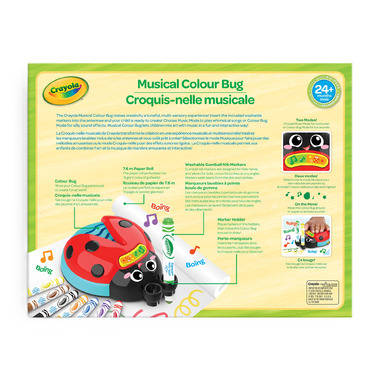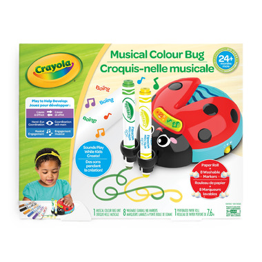 It features 1 Musical Color Bug Toy, 7.6 m perforated roll of coloring paper, and 8 Ultra-Clean Washable Markers. Its a great toy for toddlers & kids, ages 2 & up.