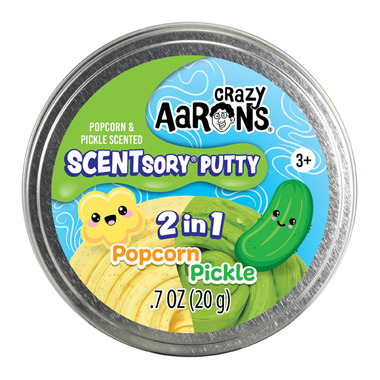 A fun way to double up your putty game. The yellow side infused with a popcorn scent and the green side infused with a pickle scent for the ultimate mashup! 2 in 1 Popcorn and Pickle SCENTsory Putty for the craziest, dill-iest, popping good time! Crazy Aarons SCENTsory Thinking Putty goes way beyond scent to invoke a total sensory experience like no other. Indulge your senses with the velvety soft touch, the dynamic look, and the wonderful scent and discover just how amazing SCENTSory Thinking Putty can make you feel. Thinking Putty helps build hand and finger strength through a fabulous tactile play experience with unique, unexpected properties and provides relaxing, yet stimulating interaction for anyone with sensory integration issues.