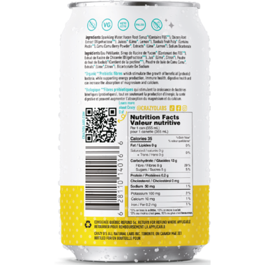 Carbonated Water, Organic Yacon Root Syrup, Chicory Root Extract, Organic Lime Juice, Organic Lemon Juice, Organic Baobab Powder, Organic Camu Camu Berry Powder, Organic Extracts (Lime, Lemon), Sodium Bicarbonate.