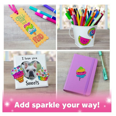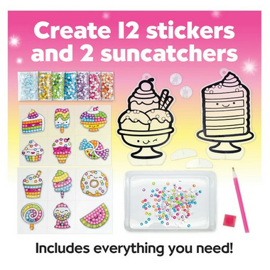 Enjoy two diamond painting activities in one kit: 12 holographic stickers include printed dots for guided gem placement, while 2 sun catchers offer an open-ended design experience. Apply your Big Gem Sweet stickers to journals, cards, notebooks, pencil cases and so much more. Display your suncatchers using the stands or included suction cups.