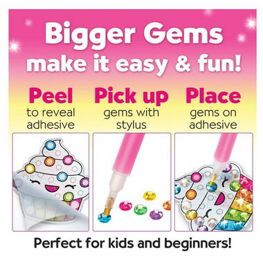 Diamond painting made simple! Larger gems, gem tray and stylus make this activity easy and fun to do for kids and beginners. No glue needed! Just peel the clear cover off the adhesive then use the stylus to pick and place the colourful gems.