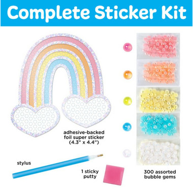 The Bubble Gem Super Sticker Rainbow features shiny foil and iridescent, Bubble Gems.​ Just follow the pre-printed color guide, then use the stylist to pick and place your pearls on the self-adhesive sticker background.​ The Bubble Gem Super Sticker Rainbow is easy and fun to do!  Decorate and customize your lunch box, notebooks, folders and more!​