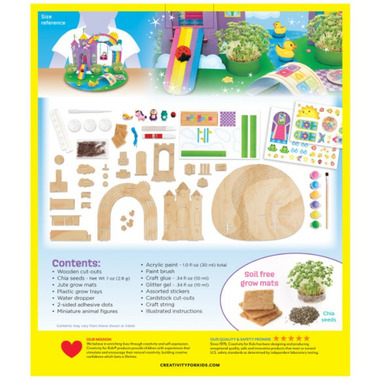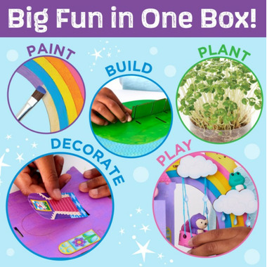 Children will love building, painting, decorating and growing their own enchanted garden habitat. So many fun details included! Miniature wooden accessories come ready to assemble and decorate. Children will love interacting with the play and pretend animals included. Add the easy-grow chia seeds to bring your gardens to life. Includes soil-free plant medium for less mess.