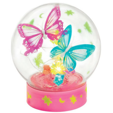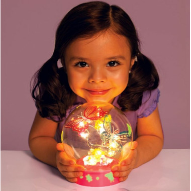 Transform these beautiful contents into an enchanted fairy light with a little crafting magic. Arrange the translucent butterflies, flowers, colourful clay, sparkling gemstones, fairy dust, glitter glue and glow-in-the-dark stickers inside your light-up base and globe. When you're done crafting, twist the globe and decorated base together to seal everything inside. Add the glow stickers to see it light up! Use as a unique room decor accent, night-light or for imaginative play. 12 strand LED lights operate on 3 AAA batteries (not included). Completed globe measures approximately 6" w x 5" h.