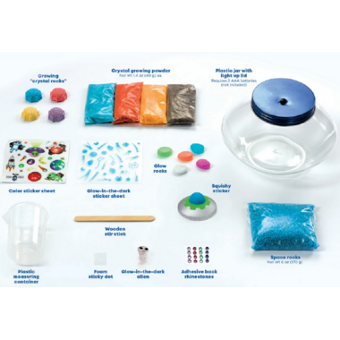 Add in the friendly alien, moon rocks, stars and constellations stickers and watch your terrarium Glow-in-the-Dark! Crystal growing is a fun and easy to do science experiment. Just add hot water and watch the crystals grow in as little as 24 hours.