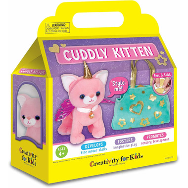 This cuddly kitten will be your purr-fect crafting companion. Decorate this plush kitten and velvety pet carrier with an array of adorable accessories including: ribbon and bell collar, metallic gold stickers, unicorn horn and shiny butterfly wings. No glue, no mess! Develops fine motor skills, fosters imaginative play and promotes sensory development. Designed to comfort and cuddle, your completed carrier measures
