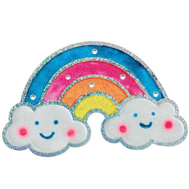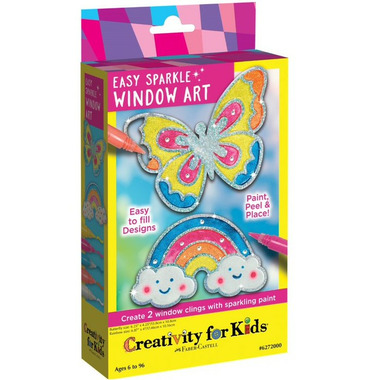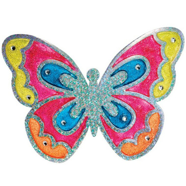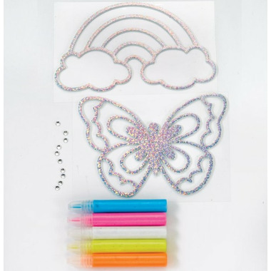 Dimensional foil Butterfly and Rainbow come ready to decorate. Just fill in the designs with an array of sparkle window paint and rhinestones. When your designs are dry, just peel off the backing and press them onto any smooth glass surface.