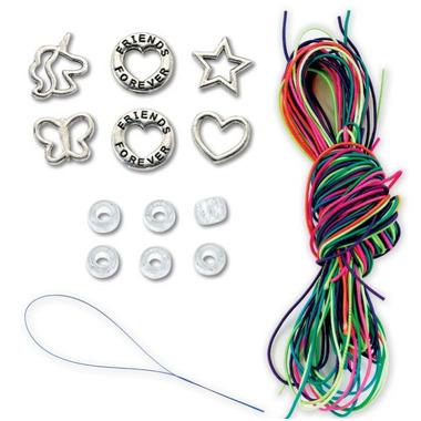 silver-tone charms, 6 pony beads, a needle threader and illustrated
