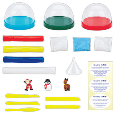 Decorate 3 child-safe, plastic snow globes with 3 winter/holiday themed resin figures and create your own winter wonderland! Use the included modeling clay and tools to create additional fun, festive accessories and decorations add your own tap water, top them off with glitter (also included and give them a shake to watch your winter scenes come to life.